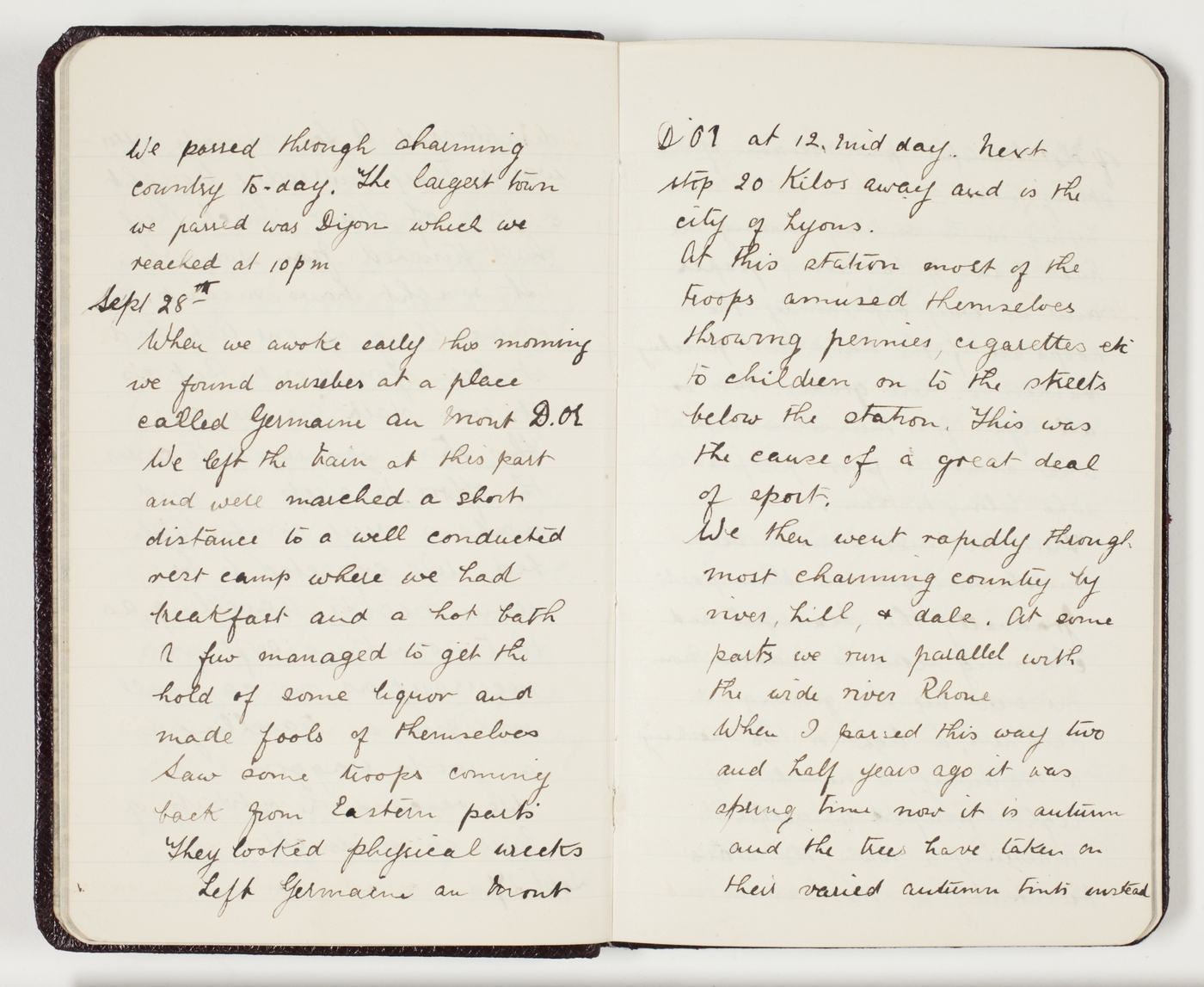 When we awoke early this morning we found ourselves at a place called [Saint] Germaine au Mont D'Or. We left the train at this part and were marched a short distance to a well conducted rest camp where we had breakfast and a hot bath. A few managed to get the hold of some liquor and made fools of themselves. Saw some troops coming back from Eastern parts. They looked physical wrecks.