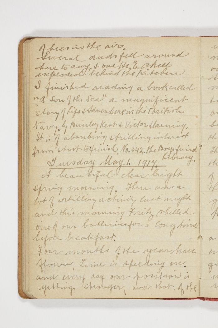 Several duds fell around here to day & one H.E. shell exploded behind the kitchen. I finished reading a book called "A Son of the Sea" a magnificent story of Life & Adventure in the British Navy by Beverley Keat & Victor Darning. It is of absorbing & trilling interest from start to finish. No 342. The Boys friend Library.