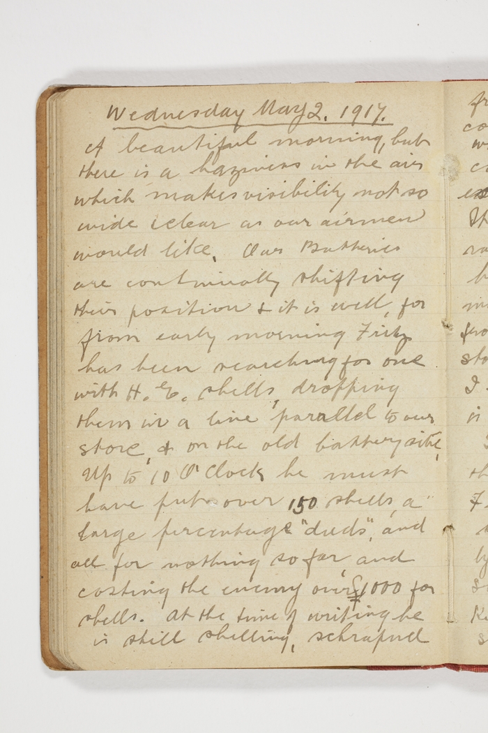 A beautiful morning, but there is a haziness in the air which makes visibility not so wide & clear as our airmen would like. Our Batteries are continually shifting their position & it is well, for Fritz has been reaching for one with H.E. shells, dropping them in a line parallel to our store, & on the old battery site. Up to 10 O'clock he must have put over 150 shells, a large percentage "duds", and all for nothing so far, and costing the enemy over £1000 for shells. At the time of writing he is still shelling, schrapnel from the bursting shells coming quite close to our billets. When I was shaving I saw a company of soldiers narrowly escape being hit with a shell. It burst in front of them, they ran across, when a "dud" fell behind them.