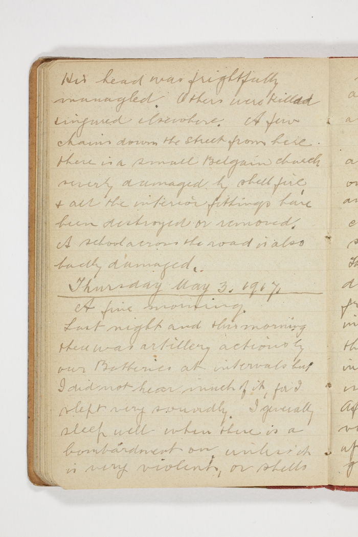 A fine morning. Last night and again this morning there was artillery actions by our Batteries at intervals but I did not hear much of it, for I slept very soundly. I generally sleep well when there is a bombardment on unless it is very violent, or shells bursting close. Fritz again put over some shells and "duds" this morning.