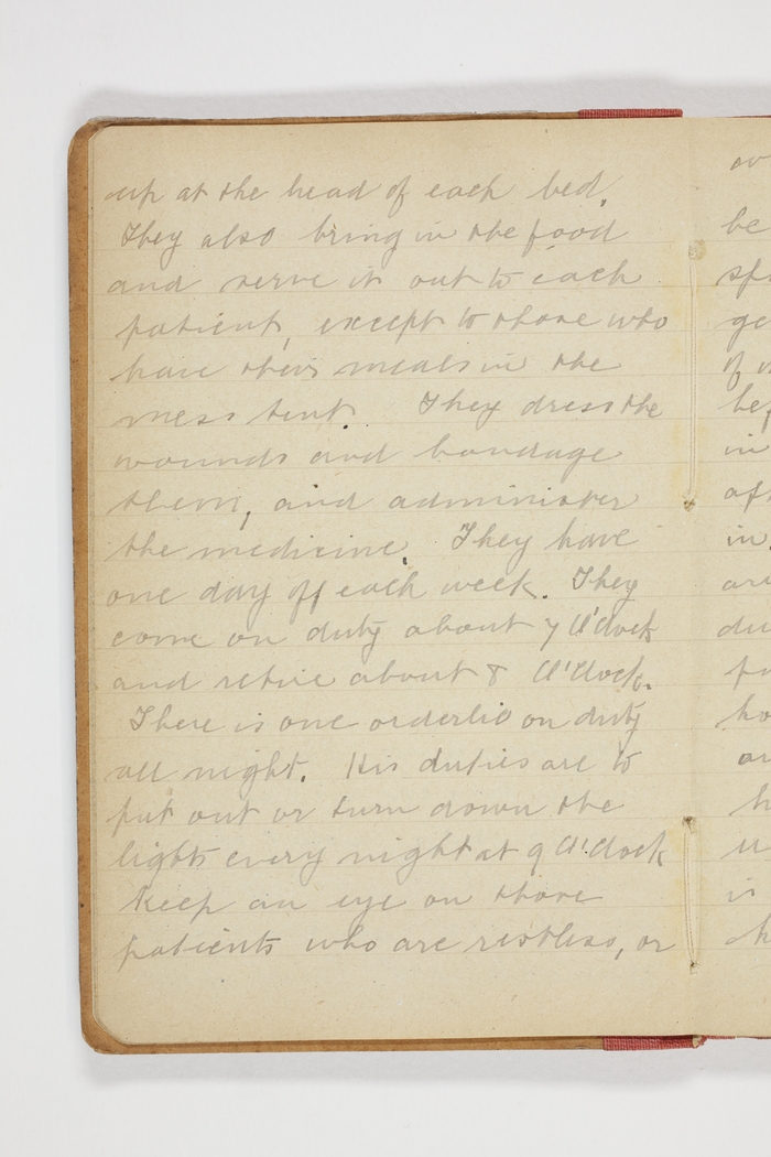 up at the head of each bed. They also bring in the food and serve it out to each patient, except to those who have their meals in the mess tent. They dress the wounds and bandage them, and administer the medicine. They have one day off each week. They come on duty about 7 o'clock. There is one orderlie on duty all night. His duties are to put out or turn down the lights every night at 9 o'clock keep an eye on those patients who are restless, or whom the doctor orders to be watched. If there is a spare bed in the ward they generally avail themselves of it in preference to sitting before the stove. They go off in the morning soon after the two orderlies come in. On the whole the orderlies are very attentive to their duties, and considerate for the patients who regard the hospital as a home. There are numerous doctors, who hold the rank of captain or major or Lieut. Colonel. There is one Lieut Colonel to each hospital, one or two majors