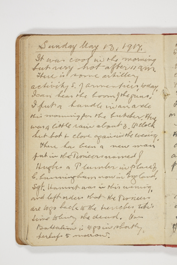 It was cool in the morning but very hot after 11 am. There is some artillery activity S. of Armentieres, to day. I can hear the boom of the guns. I put a handle in an [indecipherable] this morning for the butcher. There was a little rain about 3 O'cLock but hot & close again in the evening.