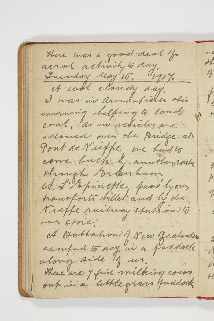 A cool cloudy day. I was in Armentieres this morning helping to load coal. As no vehicles are allowed over the Bridge at Pont de Nieppe, we had to come back by another route through [indecipherable]. A L'Epinette pass by our transports billet and by the Nieppe railway station to our store.