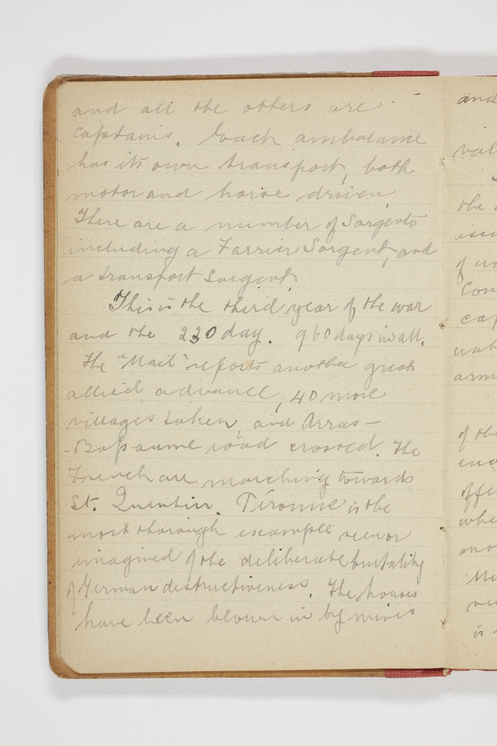 This is the third year of the war and the 230 day. 960 days in all. The "Mail" reports another great allied advance, 40 more villages taken, and Arras – Bapaume road crossed. The French are marching towards St Quentin. Peronne is the most thorough example seen or imagined of the deliberate brutality of German destructiveness. The houses have been blown in by mines and furniture and everything of value removed or smashed.
