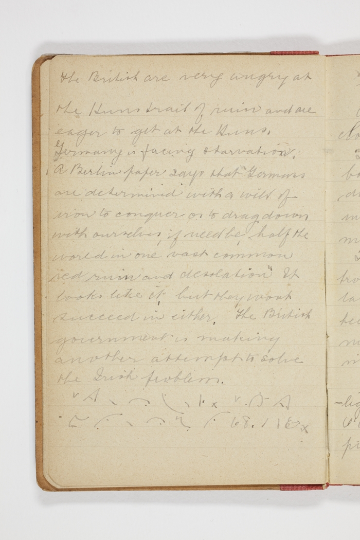 The British are very angry at the Huns trail of ruin and are eager to get at the Huns, Germany is facing starvation. A Berlin paper says that Germans are determined with a will of iron to conquer or to drag down with ourselves, if need be, half the world in one vast common XXX ruin and desolation. It looks like it, but they wont succeed in either. The British government is making another attempt to solve the Irish problem.