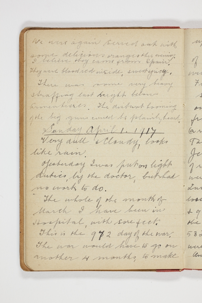 Yesterday I was put on light duties, by the doctor, but had no work to do. The whole of the month of March I have been in Hospital, with sore feet. This is the 972 day of the war. The war would have to go on another 4 months, to make up Kitchener's estimate of 3 years; but I don't think it will last that long.