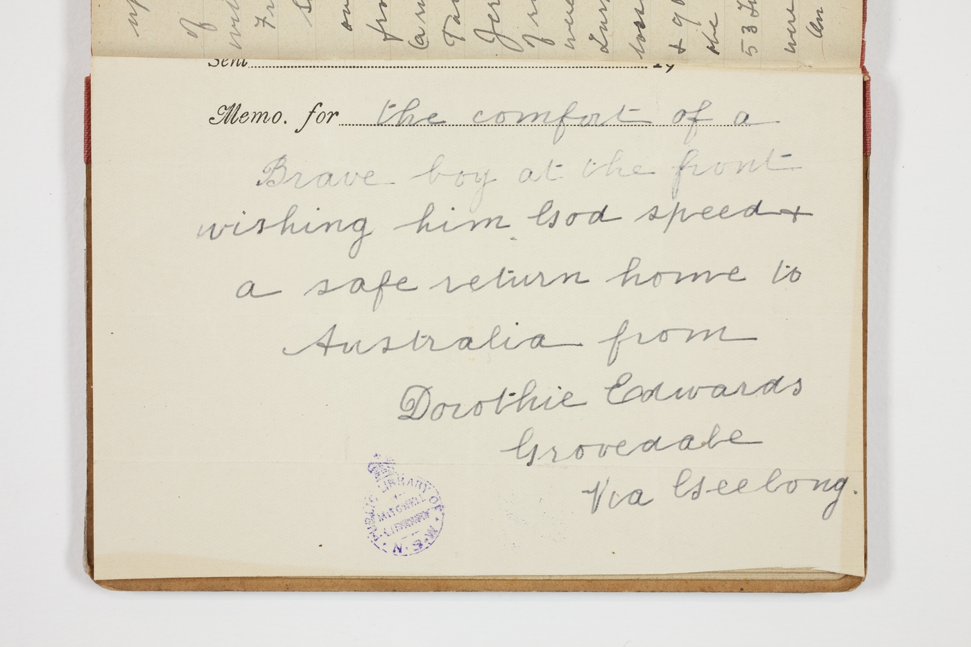 the comforts of a Brave boy at the front wishing him God sped & a safe return home to Australia from Dorothie Edwards Grovedale Via Geelong