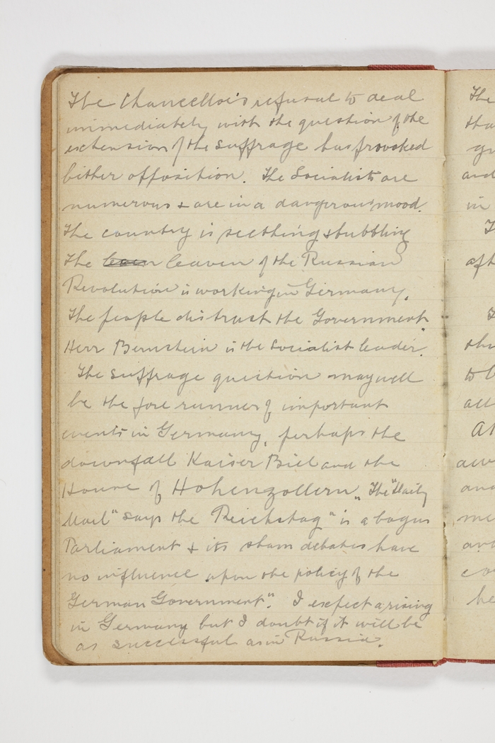 The Chancellor's refusal to deal immediately with the question of the extension of the suffrage has provoked bitter opposition. The Socialists are numerous & are in a dangerous mood. The country is seething & bubbling. The leaven of the Russian Revolution is working in Germany. The people distrust the Government. Herr Bernstein is the Socialist leader. The suffrage question may well be the forerunner of important events in Germany, perhaps the downfall [of] Kaiser Bill and the House of Hohenzollern. The "Daily Mail" says the Reichstag "is a bogus Parliament & its sham debates have no influence upon the policy of the German Government". I expect a rising in Germany but I doubt if it will be as successful as in Russia. The visiting doctor told us to day that the heads says "our heavy guns are 50 to Germany's one, and that they expect the war to finish in August.