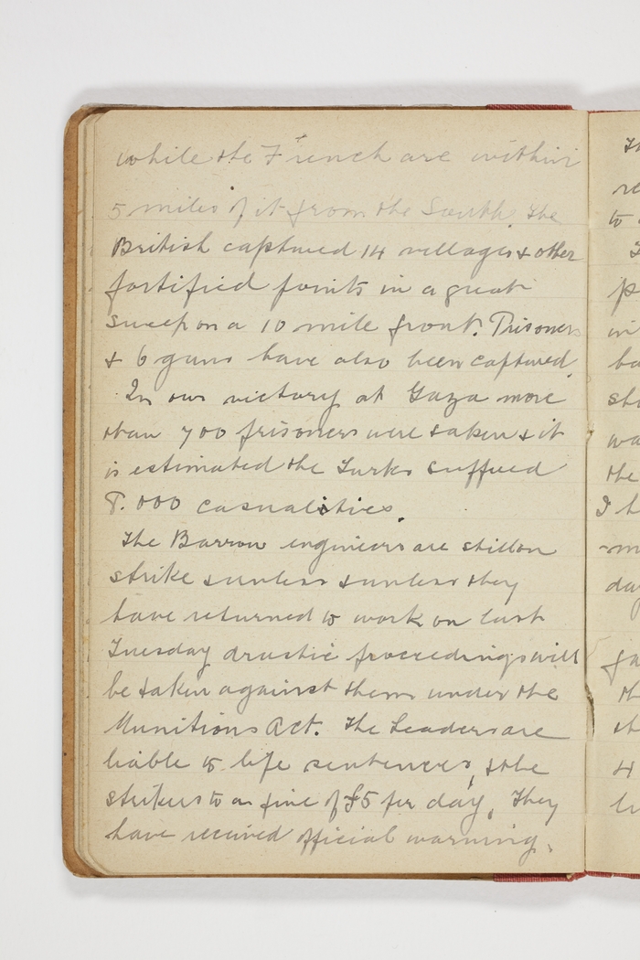 The Barrow [UK] engineers are still on strike & unless & unless they have returned to work on last Tuesday drastic proceedings will be taken against them under the Munitions Act. The Leaders are liable to life sentences, & the strikers to a fine of £5 per day. They have received official warning. Their union urges the men to resume work at once, in order to avoid trouble.