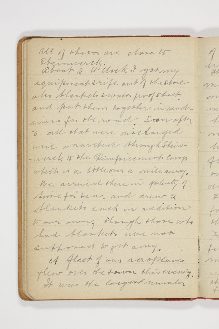About 2 o'clock I got my equipment & rifle out of the store also blankets & water proof sheet, and put them together in readiness for the road. Soon after 3 all that were discharged were marched through Steinwerck to the Reinforcement Camp which is a little over a mile away. We arrived there in plenty of time for tea, and drew 2 blankets each in addition to our own, though those who had blankets were not supposed to get any.