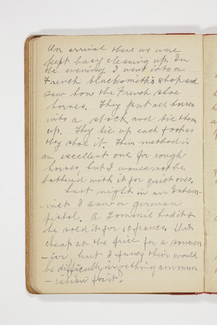 On arrival there we were kept busy cleaning up. In the evening I went into a French blacksmith's shop and saw how the French shoe horses. They put all the horses into a stock and tie them up. They tie up each foot as they shoe it. Their method is an excellent one for rough horses, but I would not be bothered with it for quiet ones.