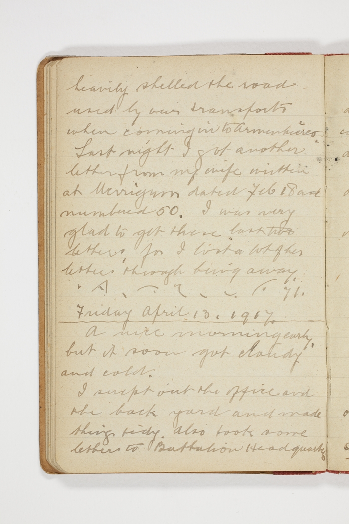 Last night I got another letter from my wife written at Merrigum dated Feb 18 and numbered 50. I was very glad to get these last two letters, for I lost a lot of her letters through being away.