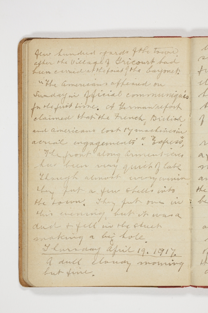 "The Americans appeared on Sunday in official communiqués for the first time. A German report claimed that the French, British and Americans lost 17 machines in aerial engagements". "Express". The front along Armentieres has been very quiet of late though almost every evening they put a few shells into the town. They put one in this evening but it was a dud & fell in the street making a big hole.