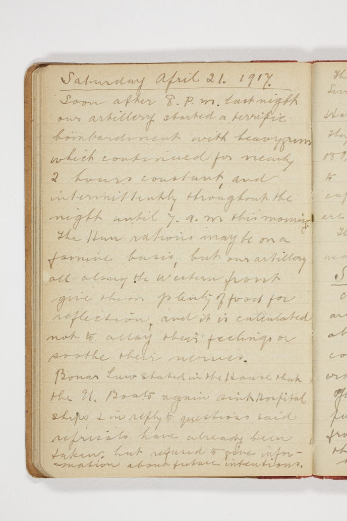 Soon after 8 p.m. last night our artillery started a terrific bombardment with heavy guns which continued for nearly 2 hours constant, and intermittently throughout the night until 7 a.m. this morning. The Hun rations may be on a famine basis, but our artillery all along the western front give them plenty of food for reflection, and it is calculated not to allay their feelings or soothe their nerves.