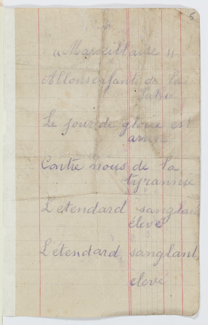 <p class="page" id="a4719005">[Page 5]</p><p>[Pages 5 and 6 -Words of the Marseillaise in French – not transcribed]</p><p>