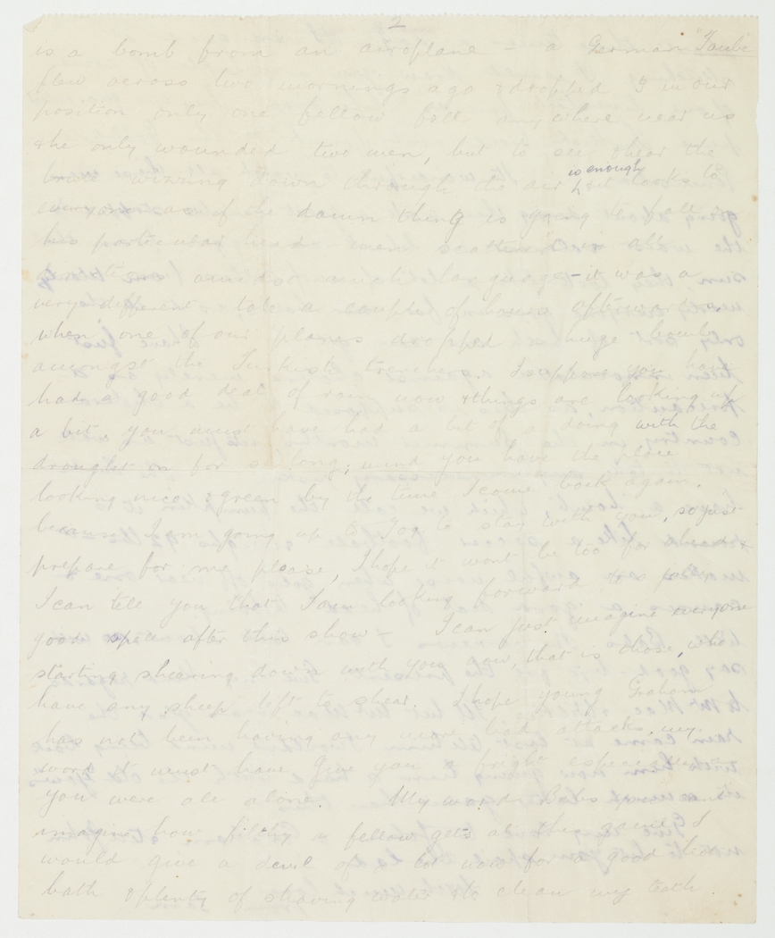 is a bomb from an aeroplane – a German Taube flew across two mornings ago & dropped 9 in our position only one fellow fell anywhere near us & he only wounded two men, but to see & hear the brute wirring down through the air is enough but looks to everyone as if the damn thing is going to fall on his particular head – men scatter in all directions admidst much language – it was a very sad different tale a couple of hours afterwards when one of our planes dropped a huge bomb amongst the Turkish trenches. I suppose you have had a good deal of rain now & things are looking up a bit. You must have had a bit of a doing with the drought on for so long, mind you have the place looking nice & green by the time I come back again, because I am going up to [indecipherable] to stay with you, so just prepare for me please, I hope it won't be too far ahead. I can tell you that I am looking forward to a good spell after this show – I can just imagine everyone starting shearing down with you now, that is those who have any sheep left to shear. I hope young Graham has not been having any more bad attacks, my word it must have give you a fright especially as you were all alone. My word Babs [indecipherable] imagine how filthy a fellow gets at this game I would give a devil of a lot now for a good hot bath & plenty of shaving water & to clean my teeth