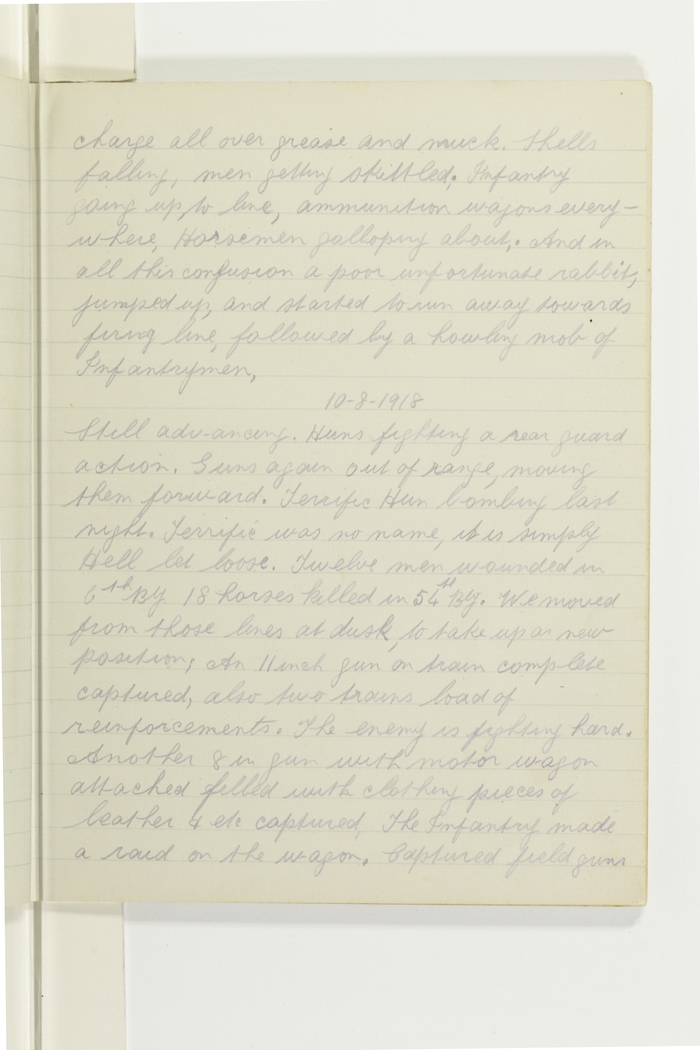 charge all over grease and muck. Shells falling, men getting skittled, Infantry going up to line, ammunition wagons everywhere, Horsemen galloping about; And in all this confusion a poor unfortunate rabbit, jumped up, and started to run away towards firing line, followed by a howling mob of Infantrymen.