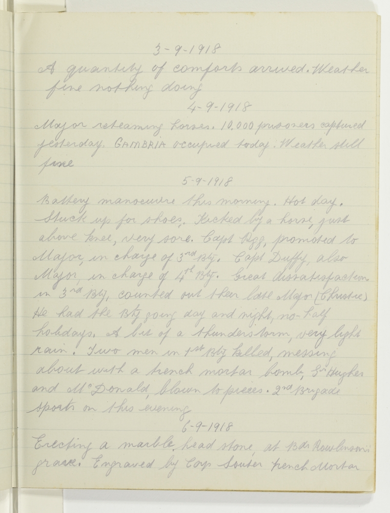 Battery manoeuvre this morning. Hot day. Stuck up for shoes. Kicked by a horse, just above knee, very sore. Capt. [indecipherable], promoted to Major, in charge of 3rd Bty. Capt. Duffy, also Major, in charge of 4th Bty. Great dissatisfaction in 3rd Bty., counted out their late Major (Christie). He had the Bty. going day and night, no half holidays. A bit of a thunderstorm, very light rain. Two men in 1st Bty. killed, messing about with a trench mortar bomb, Grs. Hughes and McDonald, blown to pieces. 2nd Brigade sports on this evening.