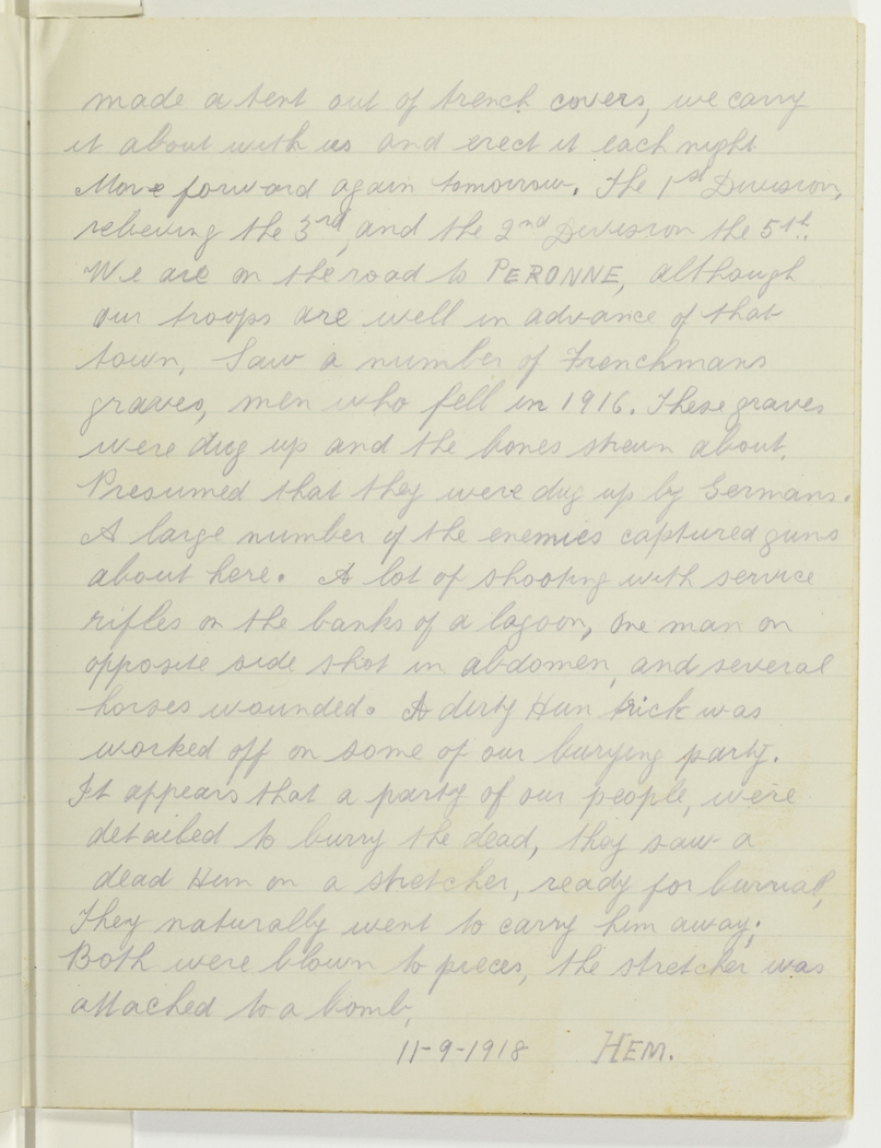 made a tent out of trench covers, we carry it about with us and erect it each night. Move forward again tomorrow. The 1st Division, relieving the 3rd, and the 2nd Division the 5th. We are on the road to Peronne, although our troops are well in advance of that town. Saw a number of Frenchmans graves, men who fell in 1916. These graves were dug up and the bones strewn about. Presumed that they were dug up by Germans. A large number of the enemies captured guns about here. A lot of shooting with service rifles on the banks of a lagoon, one man on opposite side shot in abdomen, and several horses wounded. A dirty Hun trick was worked off on some of our burying party. It appear that a party of our people were detailed to burry the dead, they saw a dead Hun on a stretcher, ready for burrial, they naturally went to carry him away; Both were blown to pieces, the stretcher was attached to a bomb.