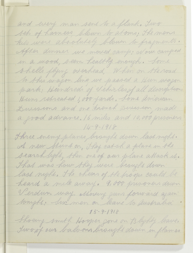 and every man sent to a flank. Two sets of harness blown to atoms. The mens kits were absolutely blown to fragments. After dinner we moved camp; now camped in a wood, seem healthy enough. Some shells flying overhead. When on the road to this wagon line, we passed a Hun wagon park: Hundreds of vehicles of all descriptions. Huns retreated 1,000 yards. Some American Divisions and one French Division, made a good advance, 16 miles and 10,000 prisoners.