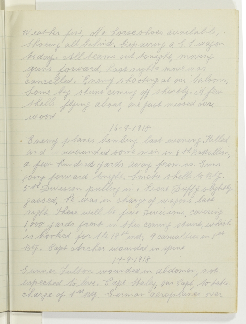 Enemy planes bombing last evening. Killed and wounded some men in 8th Battallion, a few hundred yards away from us. Guns going forward tonight. Smoke shells to Bty. 5th Division pulling in. Lieut. Duffy slightly gassed, he was in charge of wagons last night. There will be five Divisions covering 1,000 yards front in this coming stunt, which is booked for the 18th inst. 9 casualties in 1st Bty. Capt. Archer wounded in spine.