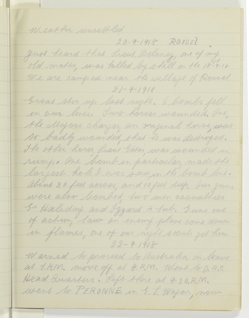Just heard that Lieut. Delaney, one of my old mates, was killed by shell on the 18th-9-18. We are camped near the village of Roisel.