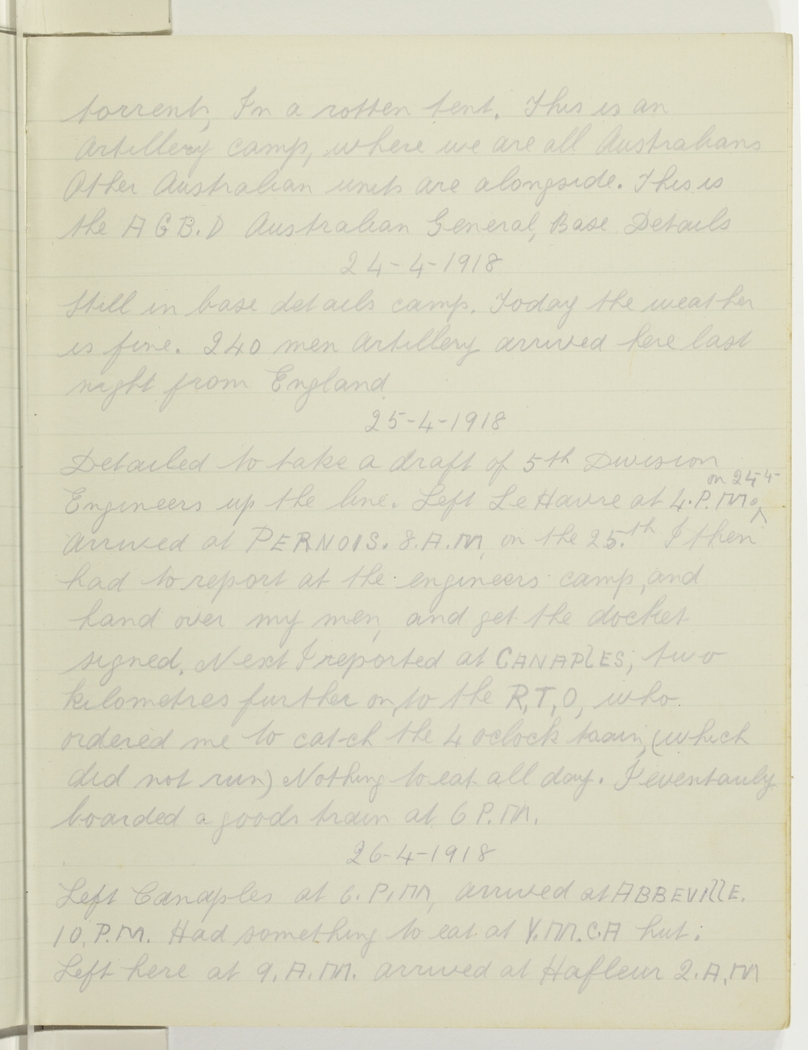 Detailed to take a draft of 5th Division Engineers up the line. Left Le Havre at 4 p.m. on 24-4, arrived at Pernois 8 a.m. on the 25th. I then had to report at the engineers camp, and hand over my men, and get the docket signed. Next I reported at Canaples, two kilometres further on, to the R.T.O., who ordered me to catch the 4 oclock train (which did not run). Nothing to eat all day. I eventually boarded a goods train at 6 p.m.