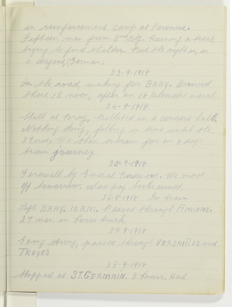 Still at Bray, Billeted in a concert hall. Nothing doing, filling in time until the 27 inst. We then entrain for an 8 days train journey.