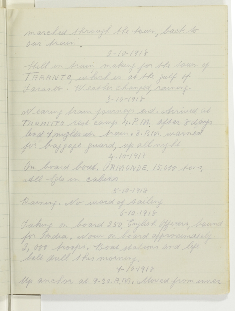 Nearing train journey's end. Arrived at Taranto rest camp 4 p.m. after 8 days and 7 nights on train. 8 p.m. warned for baggage guard, up all night.