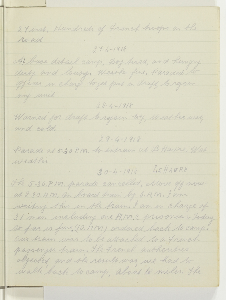 At base detail camp, Dog tired, and hungry, dirty and lousy. Weather fine. Paraded to officer in charge to get put on draft, to rejoin my unit.