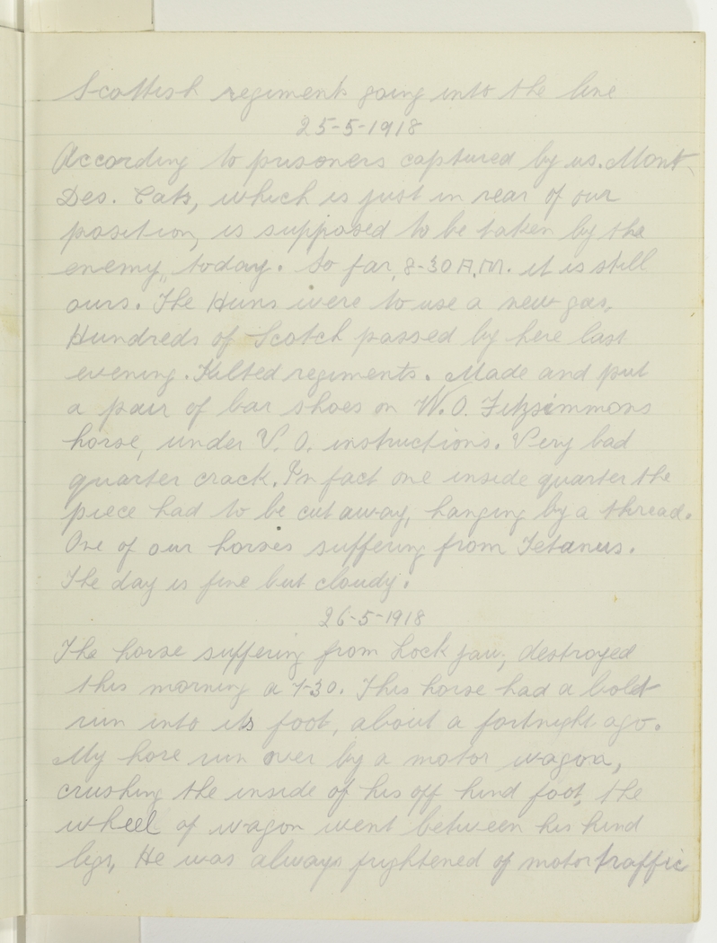 According to prisoners captured by us, Mont Des Cats, which is just in rear of our position, is supposed to be taken by the enemy today. So far, 8-30 a.m., it is still ours. The Huns were to use a new gas. Hundreds of Scotch passed by here last evening. Kilted regiments. Made and put a pair of bar shoes on W.O. Fitzsimmons' horse, under V.O. instructions. Very bad quarter crack. In fact one inside quarter the piece had to be cut away, hanging by a thread. One of our horses suffering from Tetanus. The day is fine but cloudy.