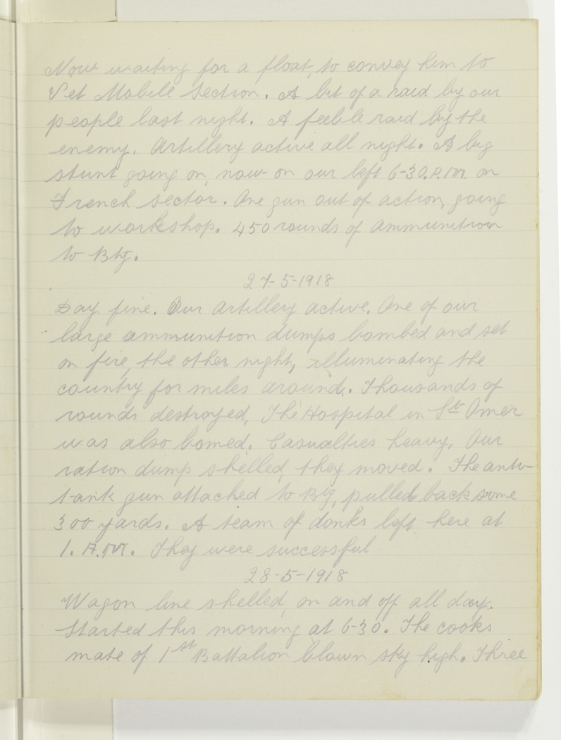 Day fine. Our Artillery active. One of our large ammunition dumps bombed and set on fire, the other night, illuminating the country for miles around. Thousands of rounds destroyed. The Hospital in St. Omer was also bomed. Casualties heavy. Our ration dump shelled, they moved. The anti-tank gun attached to Bty., pulled back some 300 yards. A team of donks left here at 1 a.m. They were successful.