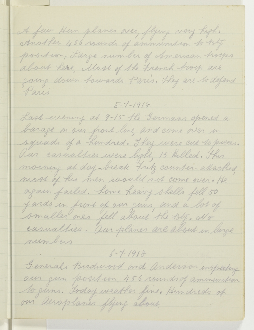 A few Hun planes over, flying very high. Another 456 rounds of ammunition to Bty. position. Large number of American troops about here. Most of the French troops are going down towards Paris. They are to defend Paris.
