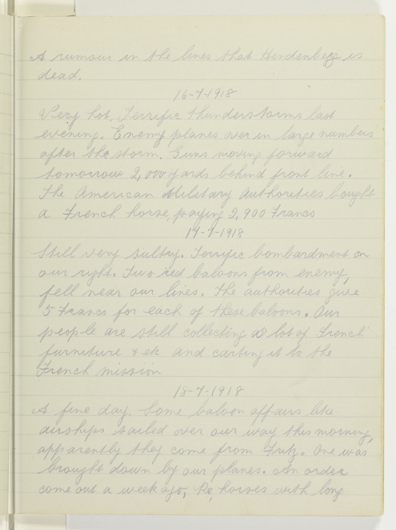 Very hot. Terrific thunderstorms last evening. Enemy planes over in large numbers after the storm. Guns moving forward tomorrow 2,000 yards behind front line. The American Military Authorities bought a French horse, paying 2,900 Francs.