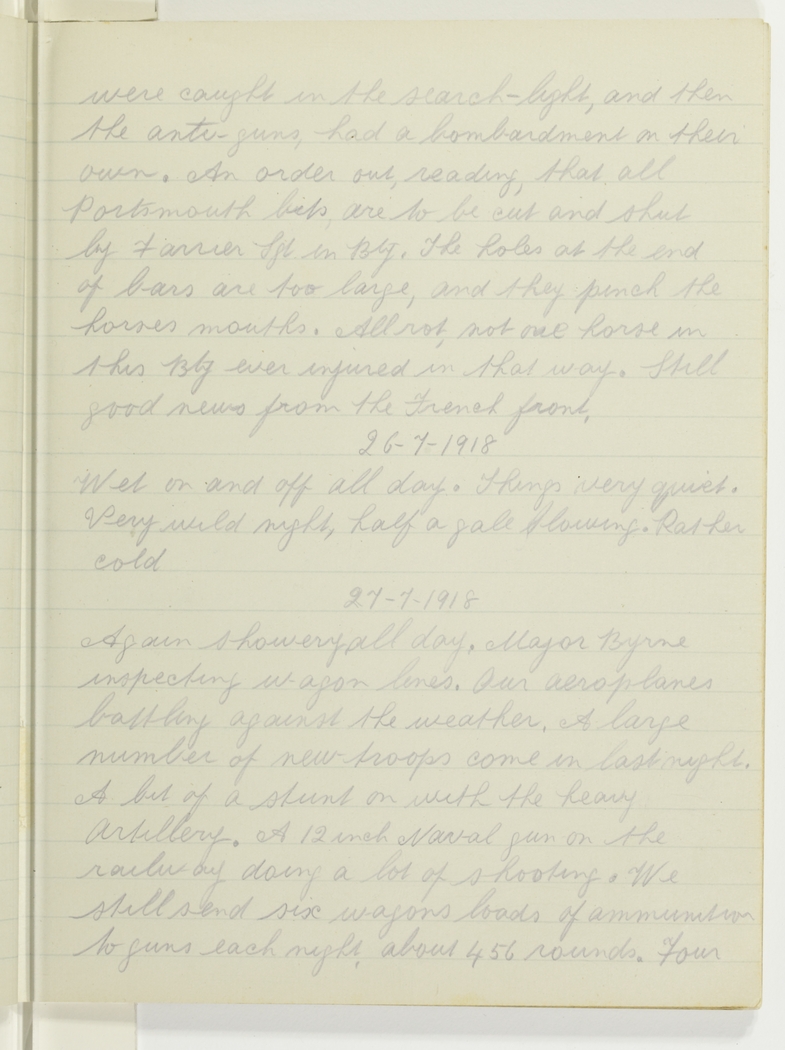 Again showery all day. Major Byrne inspecting wagon lines. Our aeroplanes battling against the weather. A large number of new troops come in last night. A bit of a stunt on with the heavy Artillery. A 12 inch Naval gun on the railway doing a lot of shooting. We still send six wagons loads of ammunition to guns each night, about 456 rounds. Four