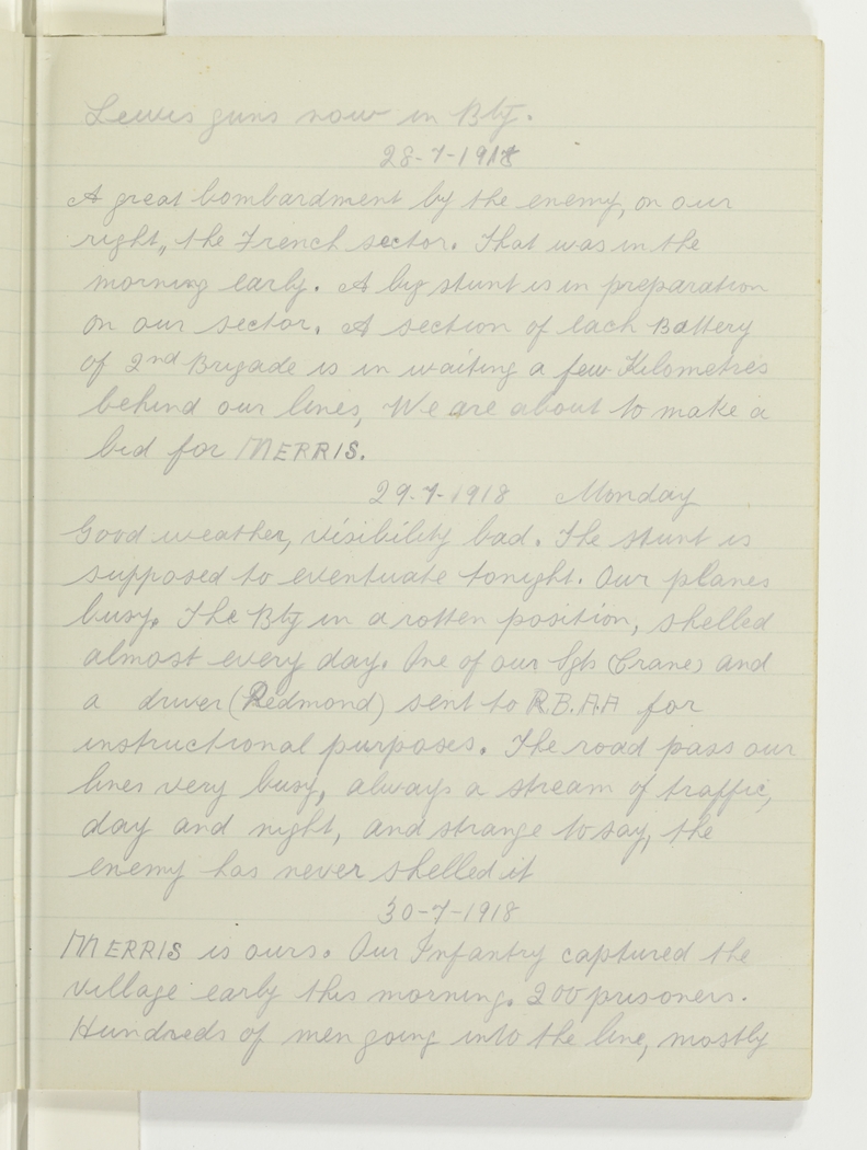 Good weather, visibility bad. The stunt is supposed to eventuate tonight. Our planes busy. The Bty. in a rotten position, shelled almost every day. One of our Sgts (Crane) and a driver (Redmond) sent to R.B.A.A. for instructional purposes. The road pass our lines very busy, always a stream of traffic, day and night, and strange to say, the enemy has never shelled it.