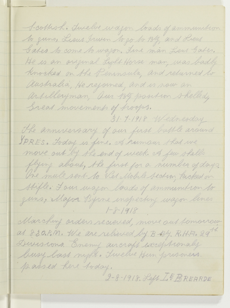 The anniversary of our first battle around Ypres. Today is fine. A rumour that we move out by the end of week. A few shells flying about, the first for a number of days. One mule sent to Vet Mobile Section, kicked on stifle. Four wagon loads of ammunition to guns. Major Byrne inspecting wagon lines.