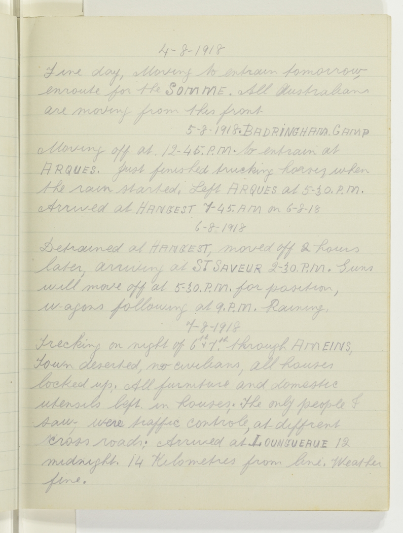 Moving off at 12-45 p.m. to entrain at Arques. Just finished trucking horses when the rain started. Left Arques at 4-30 p.m. Arrived at Hangest 7-45 a.m. on 6-8-18.