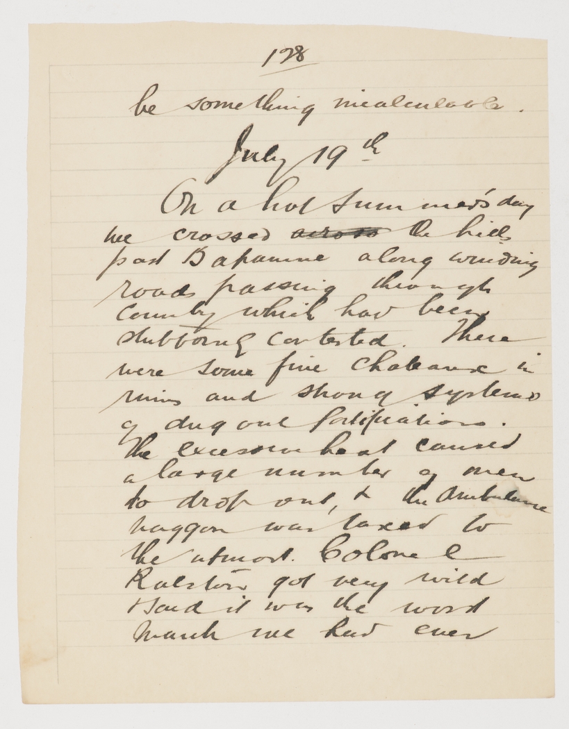 On a hot summer's day we crossed across the hill, past Bapaume along winding roads passing through country which had been stubbornly contested. There were some fine Chateaux in ruins and strong systems of dugout fortifications. The excessive heat caused a large number of men to drop out, & the Ambulance waggon was taxed to the utmost. Colonel Ralston got very wild & said it was the worst march we had ever