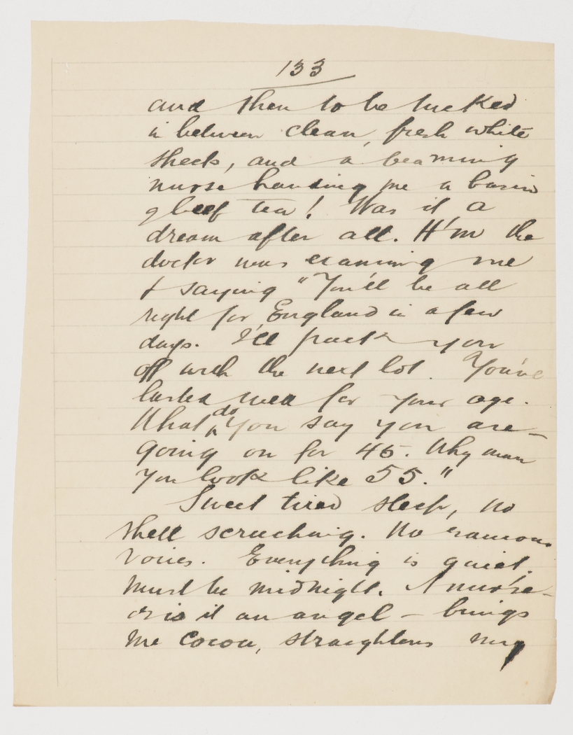 and then to be tucked in between clean, fresh white sheets, and a beaming nurse handing me a basin of beef tea! Was it a dream after all. H'm the doctor was examining me & saying "You'll be all right for England in a few days. I'll pack you off with the next lot. You've lasted well for your age. What do you say you are going on for 46. Why man you look like 55."