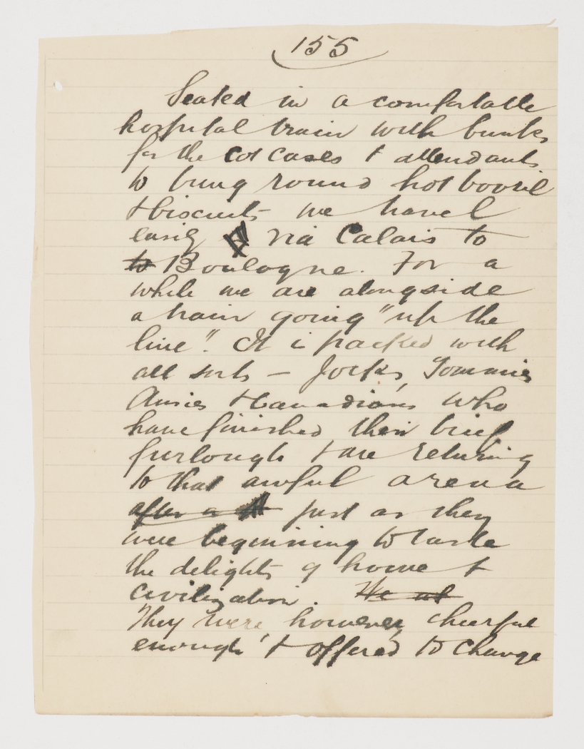 Seated in a comfortable hospital train with bunks for the cot cases & attendants to bring round hot bovril & biscuits we travel easily via Calais to to Boulogne. For a while we are alongside a train going "up the line." It is packed with all sorts – Jocks, Tommies, Aussies & Canadians who have finished their brief furlough & are returning to that awful arena after a just as they were beginning to taste the delights of home & civilization. We at They were however cheerful enough & offered to change