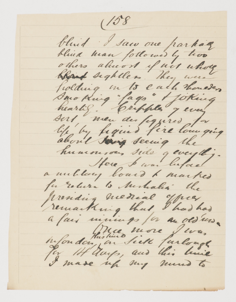 blind. I saw one partially blind man followed by two others almost if not wholly blind sightless. They were holding on to each shoulders smoking "fags" & joking heartily. Cripples of every sort, men disfigured for life by liquid fire lounging about seeing the humourous side of everything.