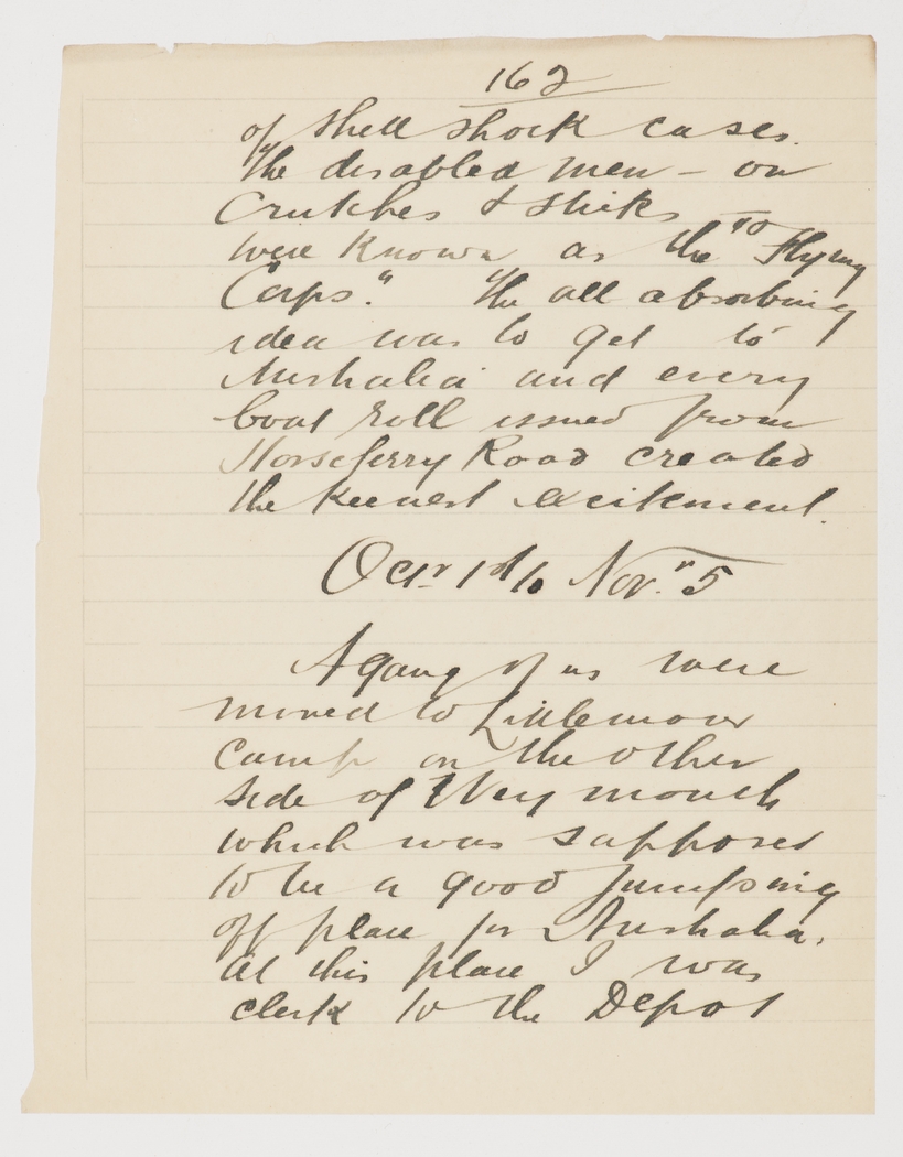 of shell shock cases. The disabled men – on Crutches & sticks – were known as the "Flying Corps." The all absorbing idea was to get to Australia and every boat roll issued from Horseferry Road created the keenest excitement.