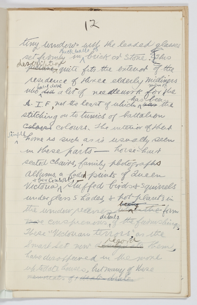 tiny windows with the leaded glasses set firmly in thick walls of brick or stone. (This picture description quite fits the exterior of the residence of three elderly milliners who have done did a bit of needlework for men of the A.I.F, not the least of which has been was the stitching on to tunics of battalion colours. The interior of their simple home is such, as is usually seen in these parts - horse-hair seated chairs, family photographs albums, a faded prints of Queen Victoria & her Consort, stuffed birds & squirrels under glass shades, & pot plants in the window recesses When the being form more conspicious details of the furnishings. These "Victorian terrors" as the Smart Set now designate regard them has disappeered in the more up to date houses, but many of these memorials of I drab drab