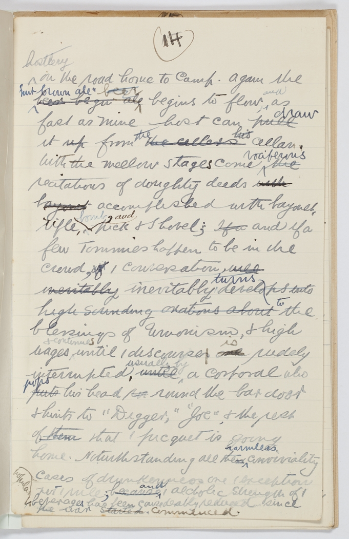 hostlery on the road home to Camp. Again the "nut brown ale" beer begins beer ale begins to flow and as fast as mine host can pull draw it up from the the cellars his cellar with the mellow stages come vociferous the recitations of doughty deeds with bayonet accomplished with bayonet, rifle, bomb and pick and shovel; If a and if a few Tommies happen to be in the crowd, if the conversation will inevitably inevitably turns develops into high sounding orations about to the blessings of Unionism & high wages & continues until the discourses is are rudely interrupted, usually by until a corporal who pops puts his head in round the bar door & hints to "Digger," "Joe" & the rest of them that the picquet is going home. Notwithstanding all their harmless conviviality cases of drunkeness are the exception not the rule; because and the alcoholic strenght of the popular beverages has been considerably reduced since the war started commenced.