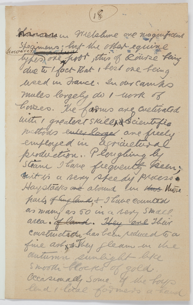 I have seen in Wiltshire are magnificent specimens but the other equine types however are poor, this of course being due to the fact that the best one being used in France. In our camps mules largely do the work of horses. The farms are cultivated with the greatest skill, Scientific methods enter large are freely employed in agricultural production. Ploughing by steam I have frequently seen; it is a very speedy process. Haystacks are abound in thes these parts of England, & I  have counted as many as 50 in a very small area. of land. They are Their contructedion  has been reduced to a fine art, They gleam in the autumn sunlight like smooth blocks of gold. Occasionally some of the boys lend the local farmers a hand