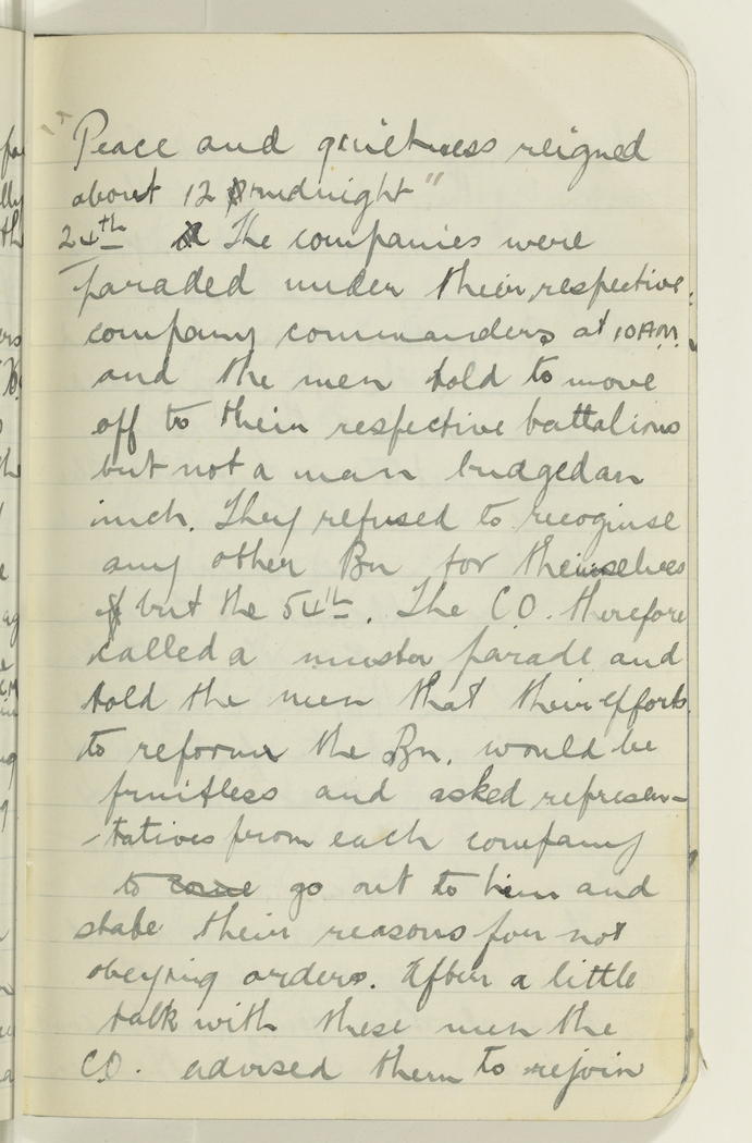 24thA The companies were paraded under their respective company commanders at 10 A.M. and the men told to move off to their respective battalions but not a man budged an inch. They refused to recognise any other Bn for themselves f but the 54th. The C.O. therefore called a muster parade and told the men that their efforts to reform the Bn. would be fruitless and asked representatives from each company to come go out to him and state their reasons for not obeying orders. After a little talk with these men the C.O. advised them to rejoin