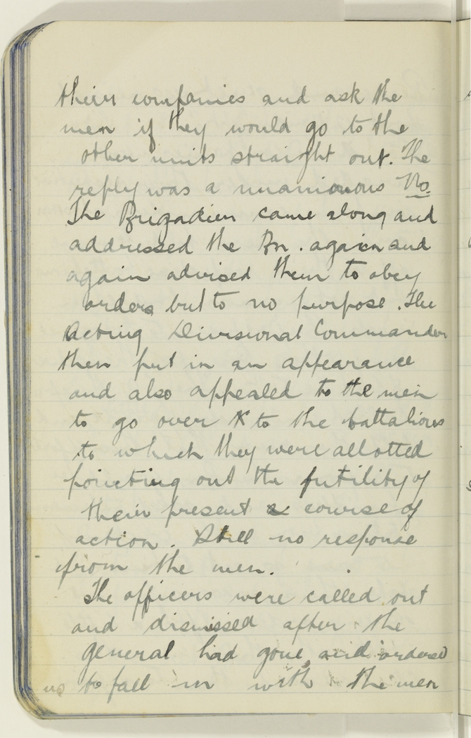 their companies and ask the men if they would go to the other units straight out. The reply was a unanimous No. The Brigadier came along and addressed the Bn. again and again advised them to obey orders but to no purpose. The Acting Divisional Commander then put in an appearance and also appealed to the men to go over to the battalions to which they were allotted pointing out the futility of their present a course of action. Still no response from the men.