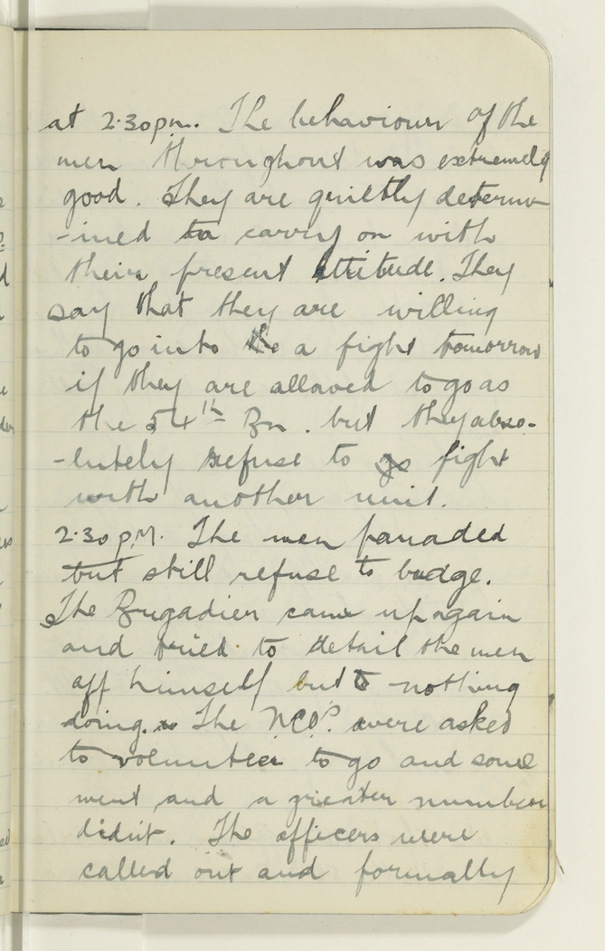 2.30 p.m. The men paraded but still refuse to budge. The Brigadier came up again and tried to detail the men off himself but to nothing doing. The N.C.O.s were asked to volunteer to go and some went and a greater number didn't. The officers were called out and formally
