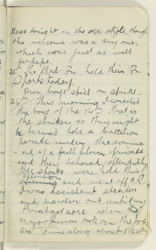 This morning I watched the boys of the 54th that is the strikers as they might be termed hold a battalion parade under the command of a full blown private and they behaved splendidly. Bde sports were held this evening afternoon and went off O.K. I was assistant starter and bawler out until my throat got sore when the Major Lucas took on the job. A n despatch came along about 5.30 p.m.